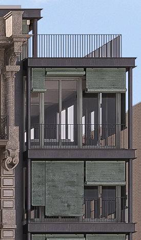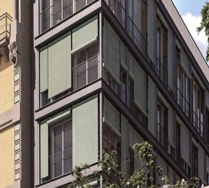 La nueva fachada se integra perfectamente con las ya existentes gracias a la utilización de uncerramiento inspirado en el diseño característico de las galerías del Eixample.
