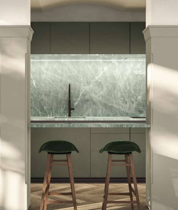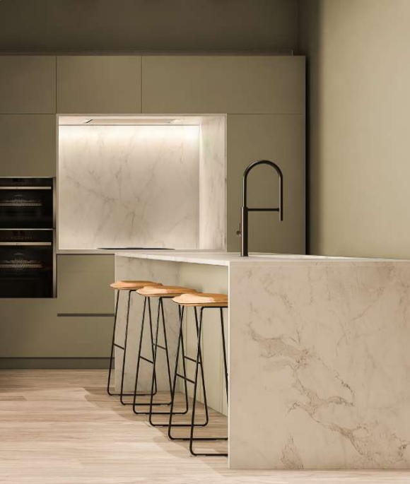 Cocina de acabado lacado, equipada con electrodomésticos NEFF, tirador oculto encimera y fregadera en acabado porcelánico y grifería NEVE.