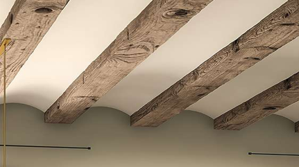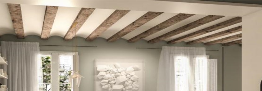 En zona comedor y dormitorio suite se mantienen y restauran los techos originales formados por revoltón cerámico enyesado y vigas de madera acabado natural. El resto de las estancias tienen techos de pladur.