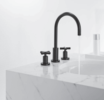 Grifería lavamanos, modelo Neve Mini Star, marca Neve, color latón envejecido sobrepuesto sobre encimera de mármol blanco macael.
